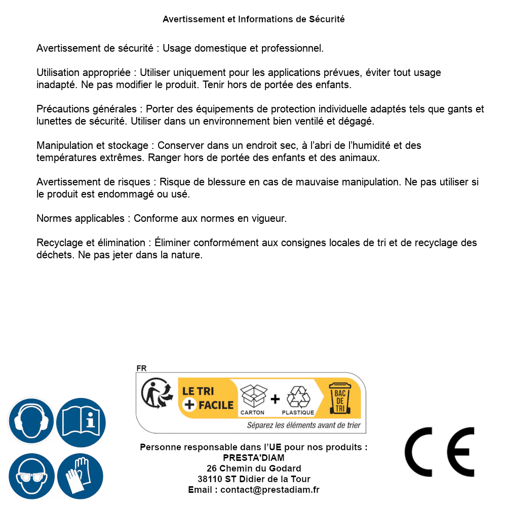 | Persona responsabile UE | PRESTA'DIAM 26 Chemin du Godard 38110 ST Didier de la Tour Email : contact@prestadiam.fr |