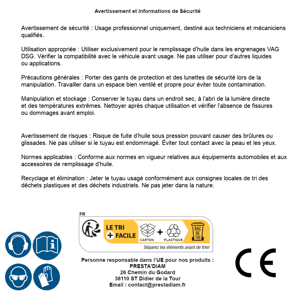 | Persona responsabile UE | PRESTA'DIAM 26 Chemin du Godard 38110 ST Didier de la Tour Email : contact@prestadiam.fr |