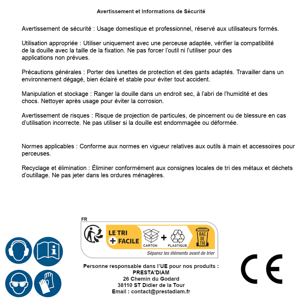 | Persona responsabile UE | PRESTA'DIAM 26 Chemin du Godard 38110 ST Didier de la Tour Email : contact@prestadiam.fr |