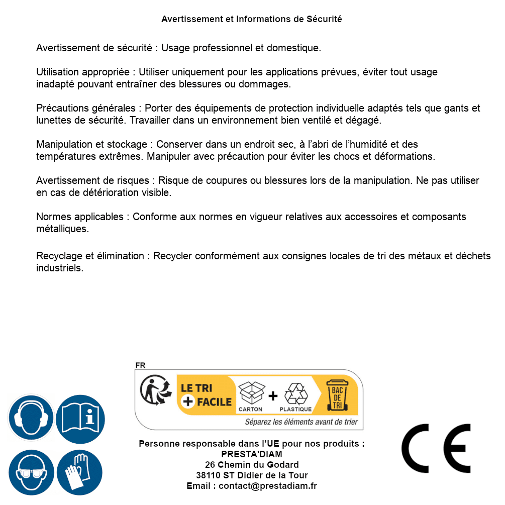 | Persona responsabile UE | PRESTA'DIAM 26 Chemin du Godard 38110 ST Didier de la Tour Email : contact@prestadiam.fr |