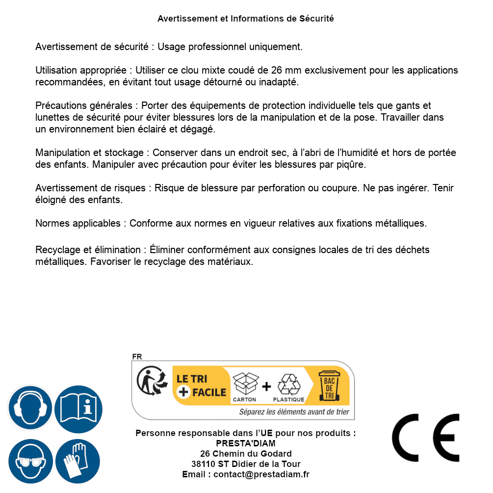| Persona responsabile UE | PRESTA'DIAM 26 Chemin du Godard 38110 ST Didier de la Tour Email : contact@prestadiam.fr |
