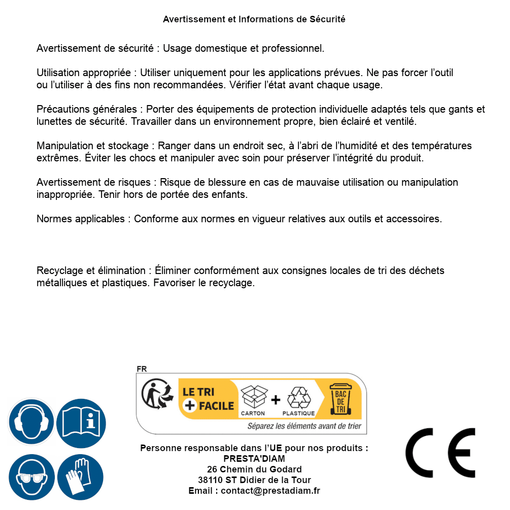 | Persona responsabile UE | PRESTA'DIAM 26 Chemin du Godard 38110 ST Didier de la Tour Email : contact@prestadiam.fr |