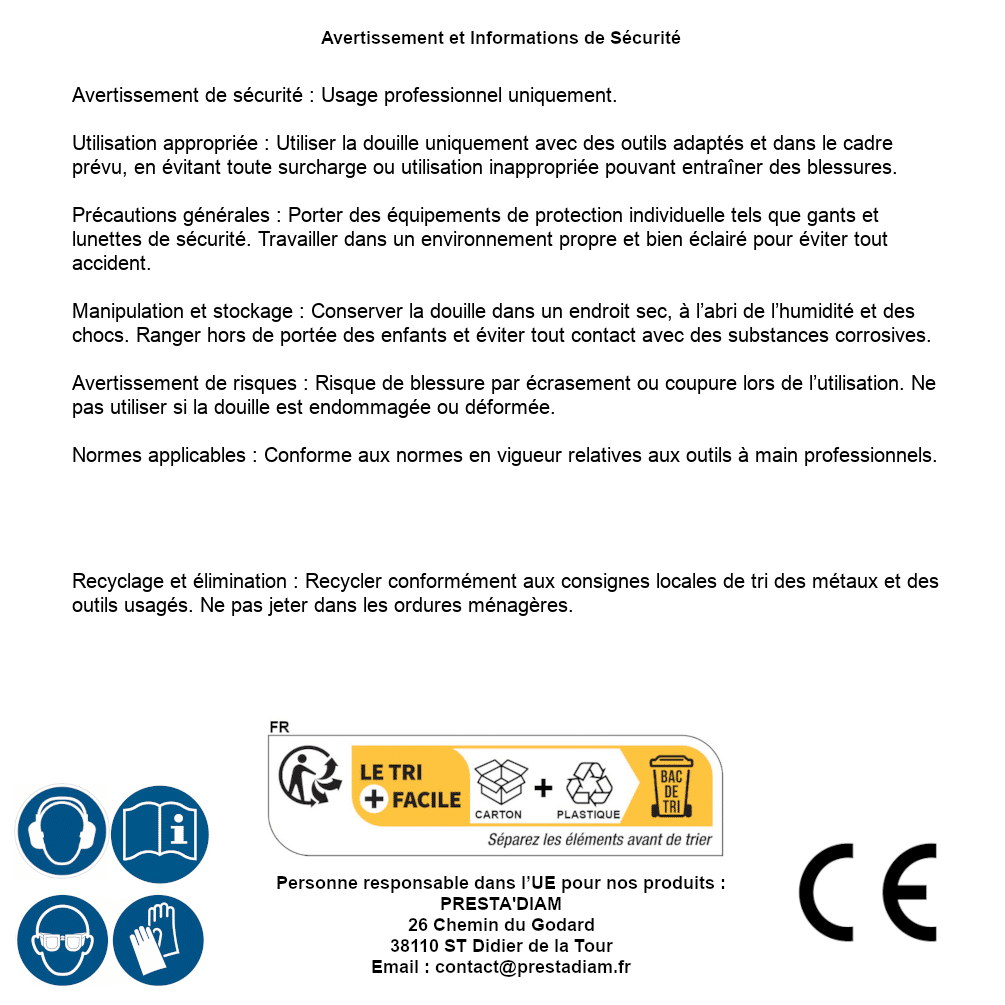 | Persona responsabile UE | PRESTA'DIAM 26 Chemin du Godard 38110 ST Didier de la Tour Email : contact@prestadiam.fr |