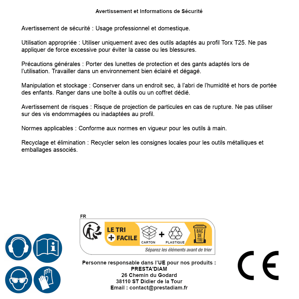 | Persona responsabile UE | PRESTA'DIAM 26 Chemin du Godard 38110 ST Didier de la Tour Email : contact@prestadiam.fr |