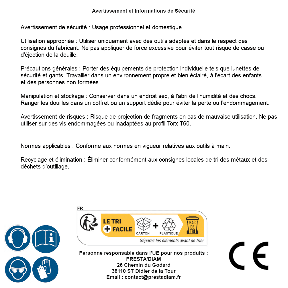 | Persona responsabile UE | PRESTA'DIAM 26 Chemin du Godard 38110 ST Didier de la Tour Email : contact@prestadiam.fr |