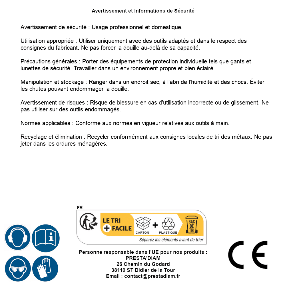 | Persona responsabile UE | PRESTA'DIAM 26 Chemin du Godard 38110 ST Didier de la Tour Email : contact@prestadiam.fr |