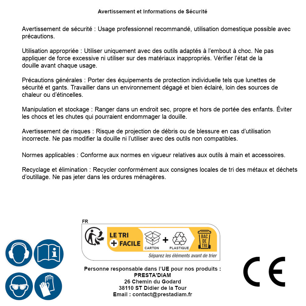 | Persona responsabile UE | PRESTA'DIAM 26 Chemin du Godard 38110 ST Didier de la Tour Email : contact@prestadiam.fr |