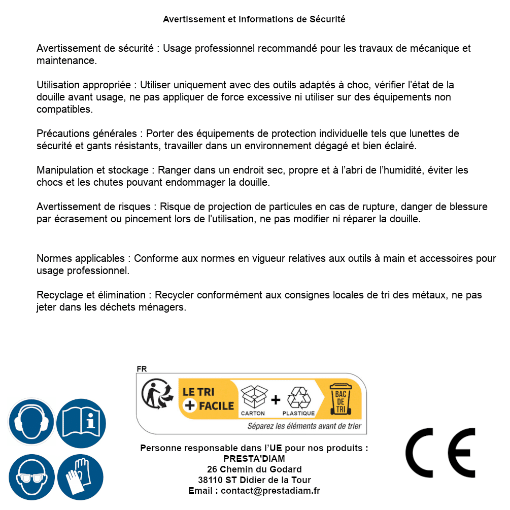 | Persona responsabile UE | PRESTA'DIAM 26 Chemin du Godard 38110 ST Didier de la Tour Email : contact@prestadiam.fr |