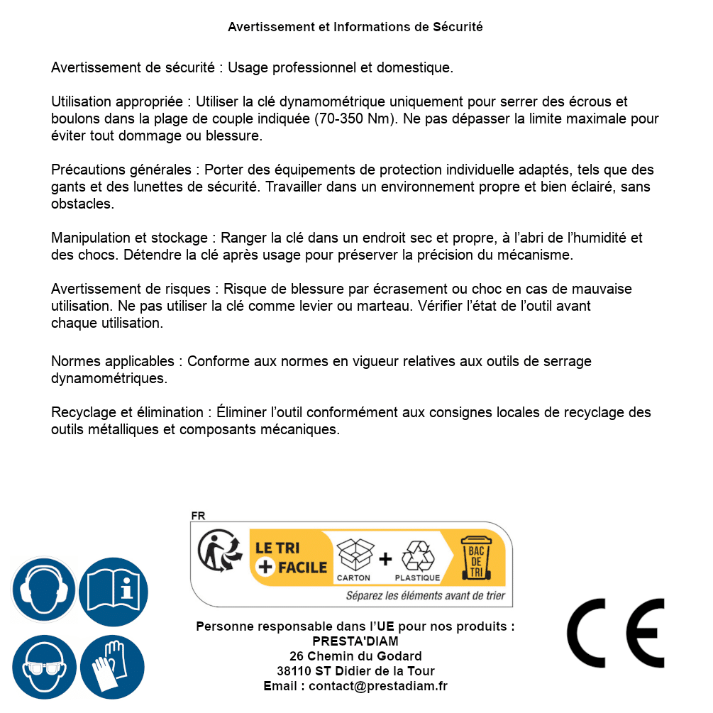 | Persona responsabile UE | PRESTA'DIAM 26 Chemin du Godard 38110 ST Didier de la Tour Email : contact@prestadiam.fr |