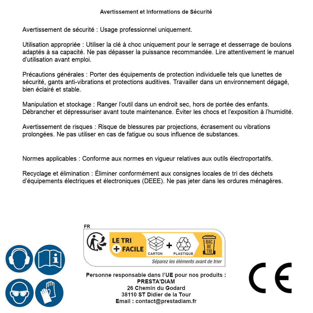 | Persona responsabile UE | PRESTA'DIAM 26 Chemin du Godard 38110 ST Didier de la Tour Email : contact@prestadiam.fr |
