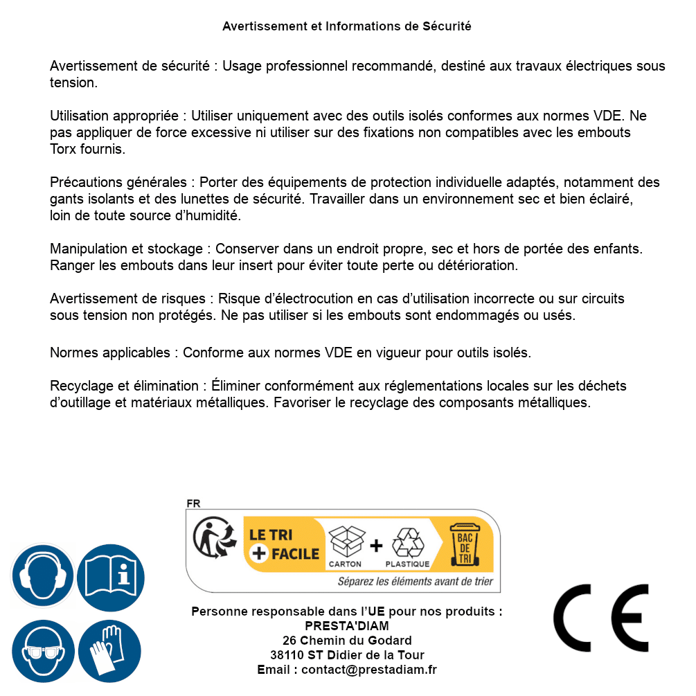 | Persona responsabile UE | PRESTA'DIAM 26 Chemin du Godard 38110 ST Didier de la Tour Email : contact@prestadiam.fr |