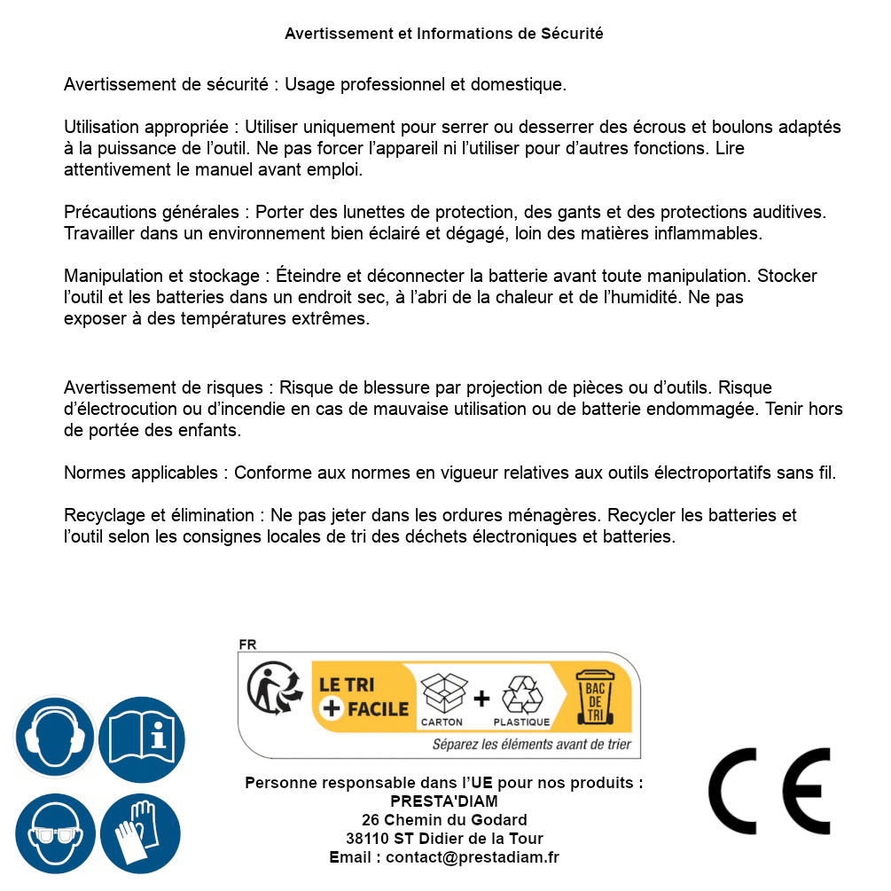 | Persona responsabile UE | PRESTA'DIAM 26 Chemin du Godard 38110 ST Didier de la Tour Email : contact@prestadiam.fr |