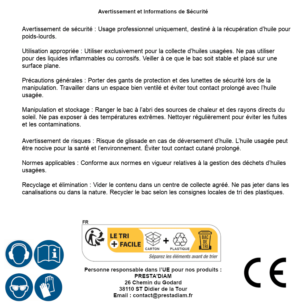 | Persona responsabile UE | PRESTA'DIAM 26 Chemin du Godard 38110 ST Didier de la Tour Email : contact@prestadiam.fr |