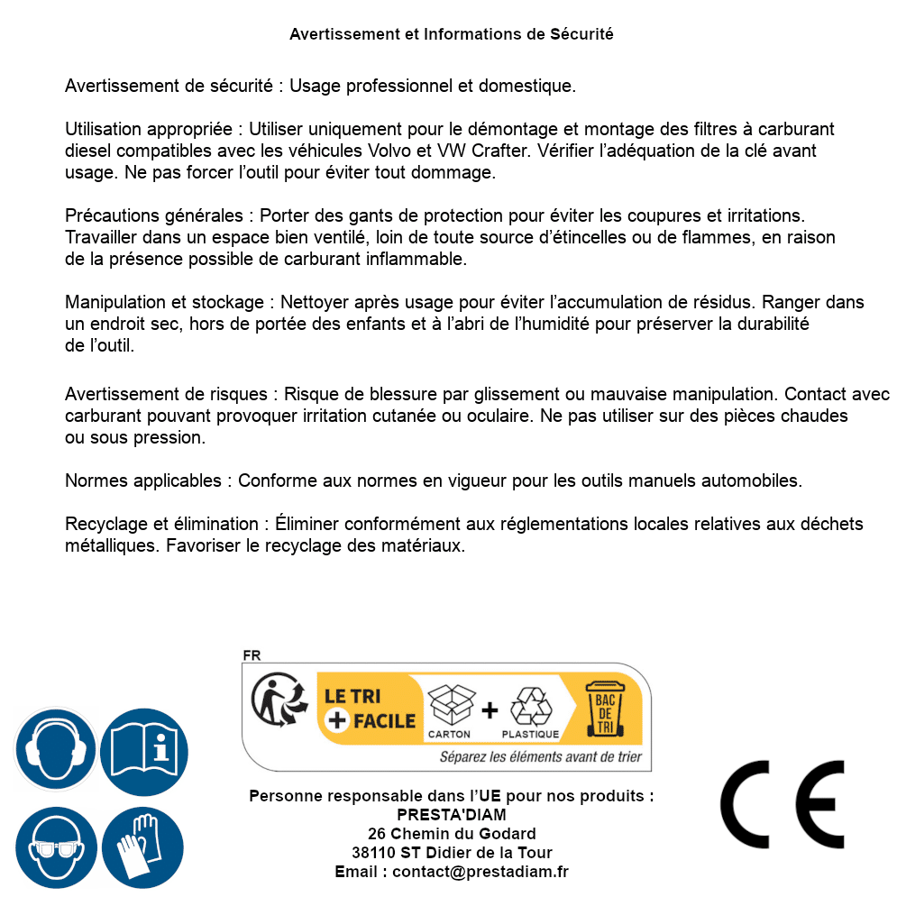 | Persona responsabile UE | PRESTA'DIAM 26 Chemin du Godard 38110 ST Didier de la Tour Email : contact@prestadiam.fr |