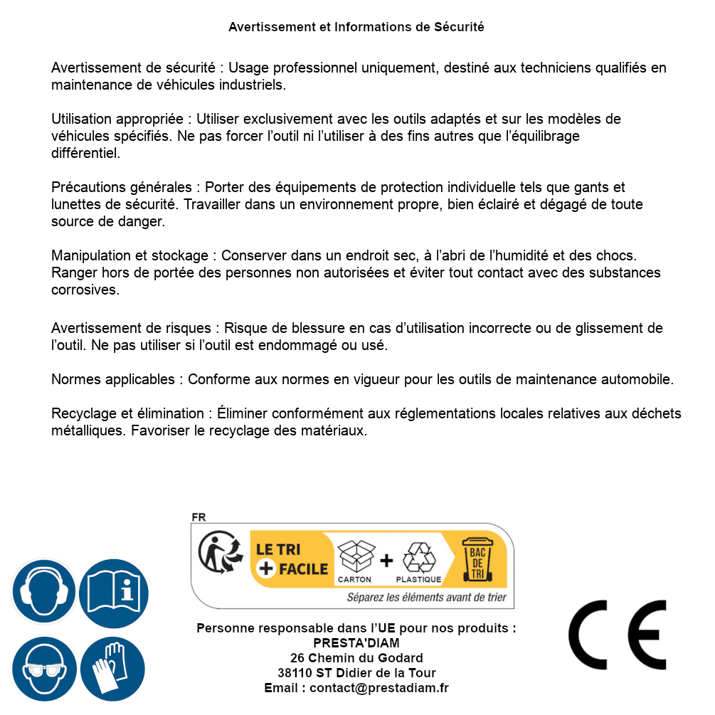 | Persona responsabile UE | PRESTA'DIAM 26 Chemin du Godard 38110 ST Didier de la Tour Email : contact@prestadiam.fr |