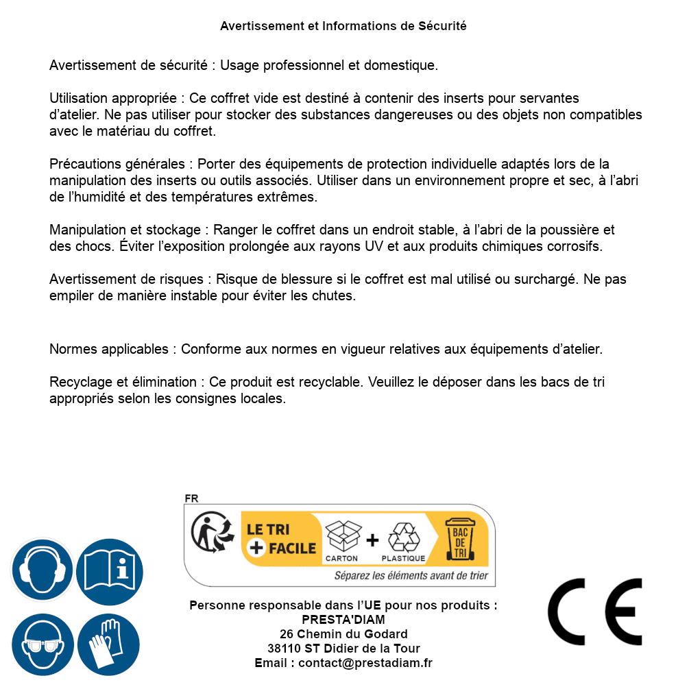 | Persona responsabile UE | PRESTA'DIAM 26 Chemin du Godard 38110 ST Didier de la Tour Email : contact@prestadiam.fr |