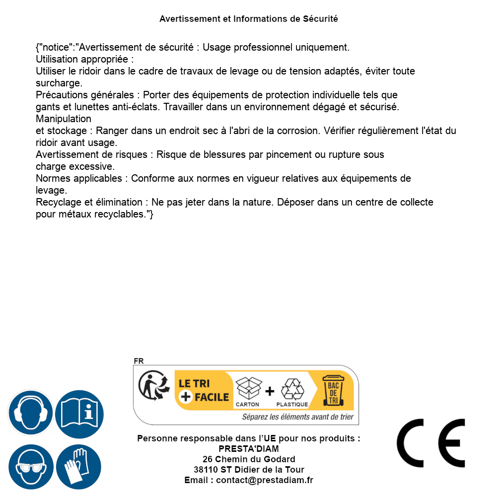 | Persona responsabile UE | PRESTA'DIAM 26 Chemin du Godard 38110 ST Didier de la Tour Email : contact@prestadiam.fr |