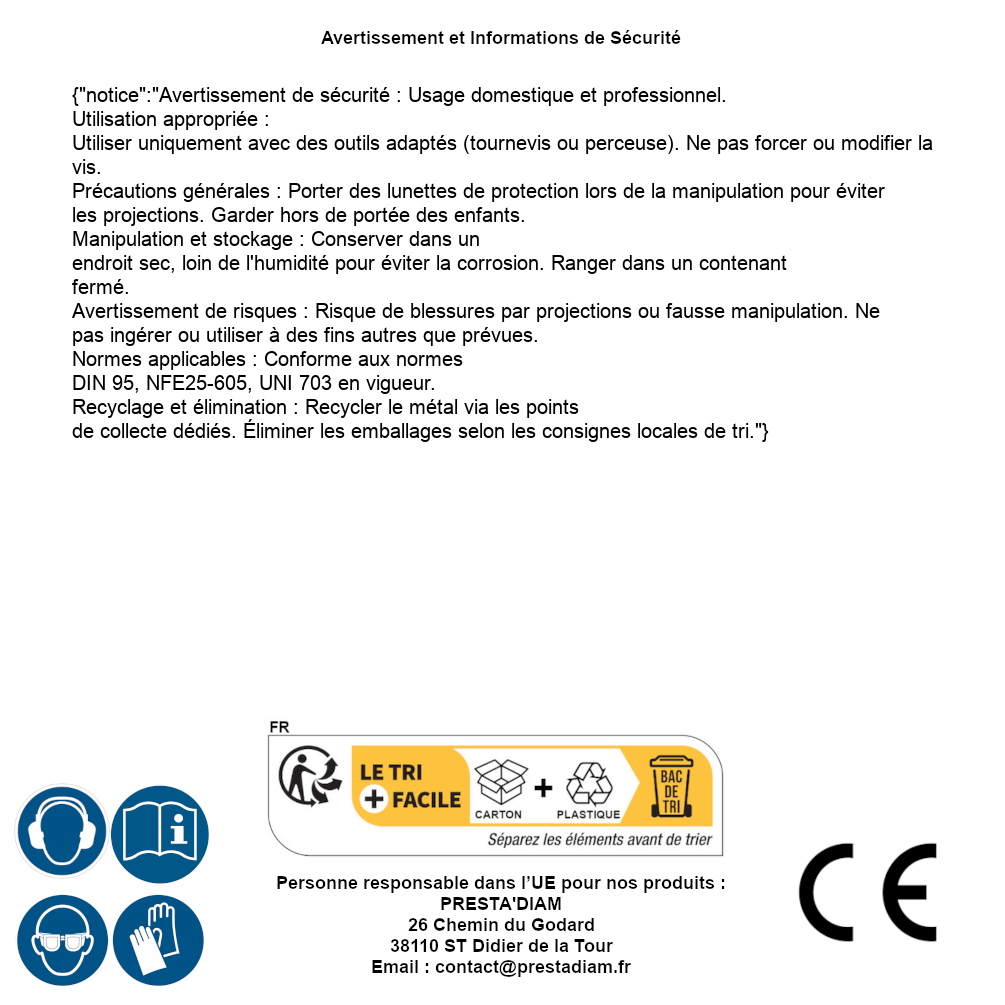 | Persona responsabile UE | PRESTA'DIAM 26 Chemin du Godard 38110 ST Didier de la Tour Email : contact@prestadiam.fr |