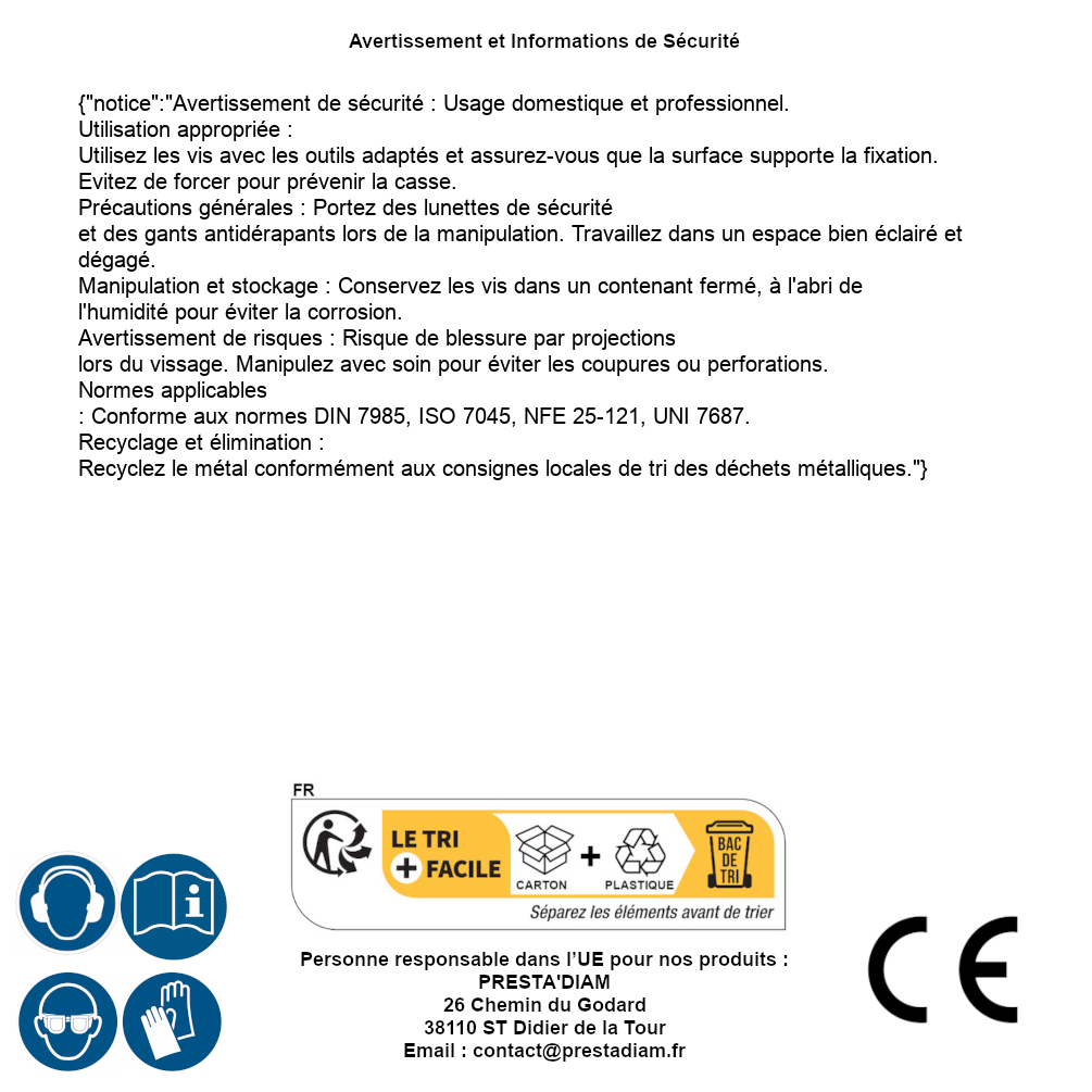 | Persona responsabile UE | PRESTA'DIAM 26 Chemin du Godard 38110 ST Didier de la Tour Email : contact@prestadiam.fr |