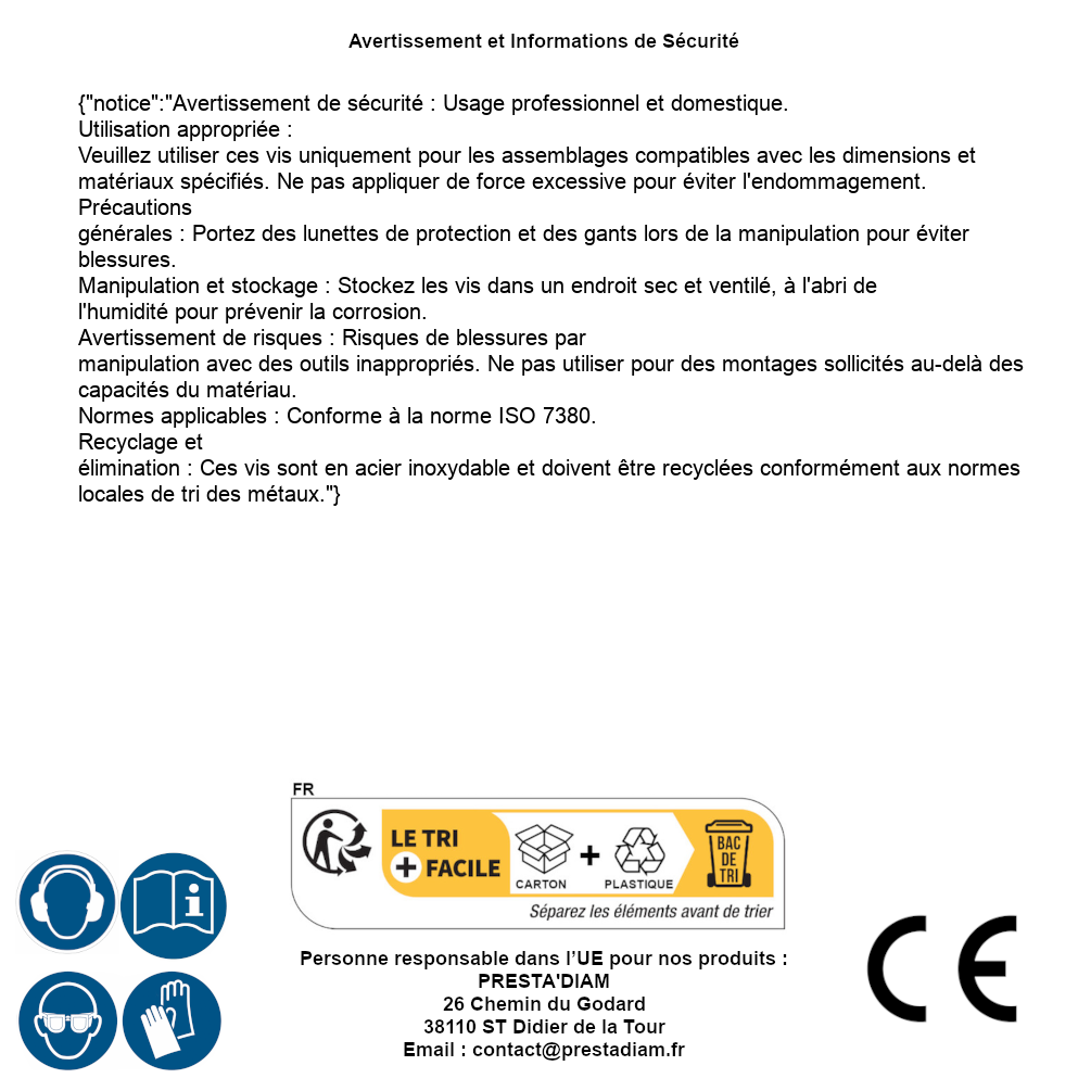 | Persona responsabile UE | PRESTA'DIAM 26 Chemin du Godard 38110 ST Didier de la Tour Email : contact@prestadiam.fr |