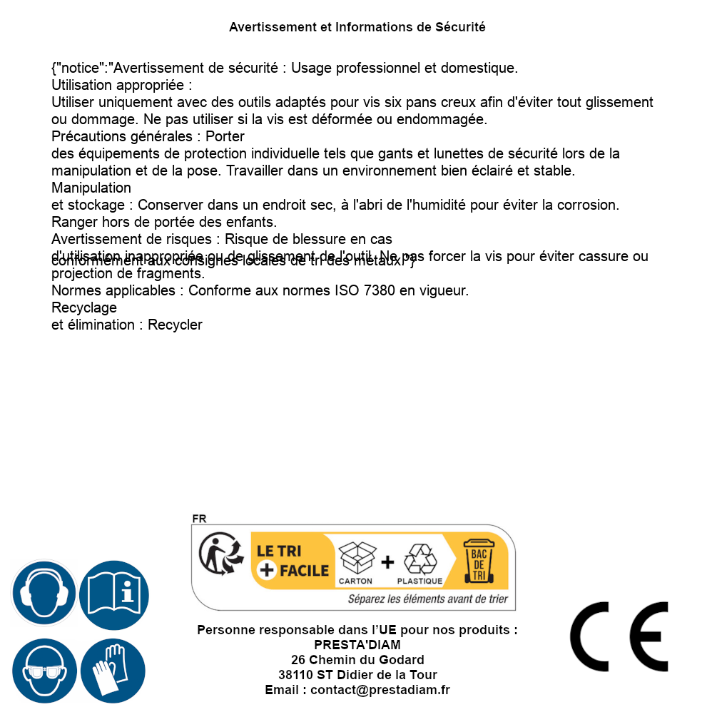 | Persona responsabile UE | PRESTA'DIAM 26 Chemin du Godard 38110 ST Didier de la Tour Email : contact@prestadiam.fr |