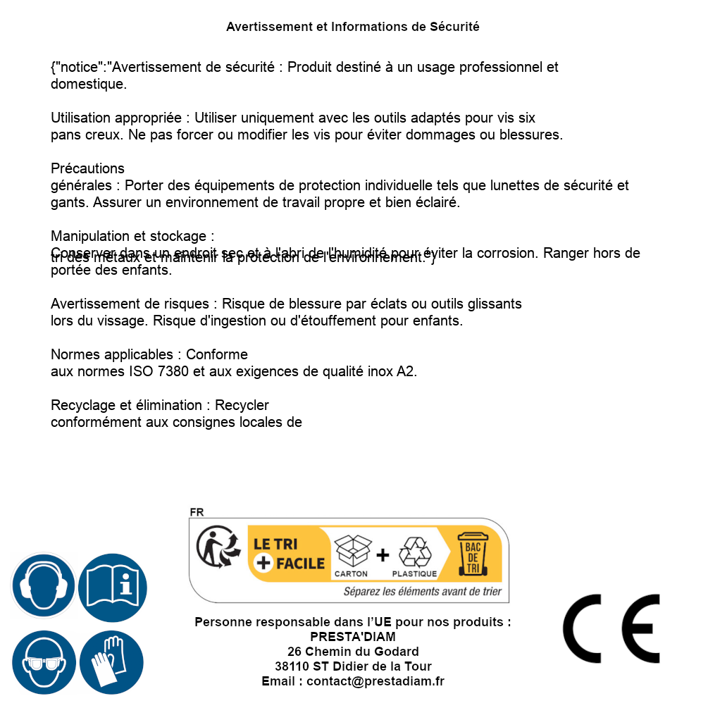 | Persona responsabile UE | PRESTA'DIAM 26 Chemin du Godard 38110 ST Didier de la Tour Email : contact@prestadiam.fr |