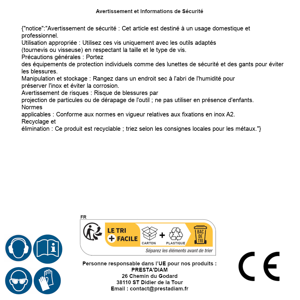 | Persona responsabile UE | PRESTA'DIAM 26 Chemin du Godard 38110 ST Didier de la Tour Email : contact@prestadiam.fr |