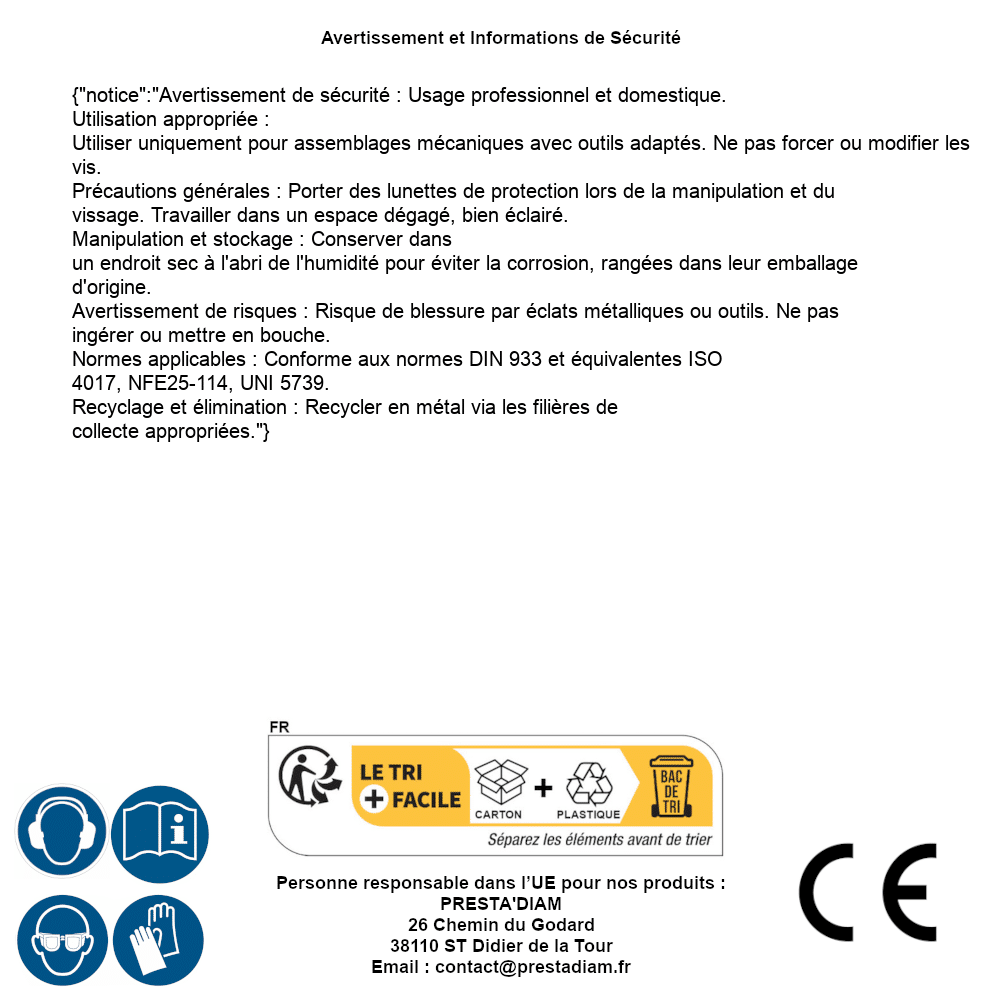 | Persona responsabile UE | PRESTA'DIAM 26 Chemin du Godard 38110 ST Didier de la Tour Email : contact@prestadiam.fr |