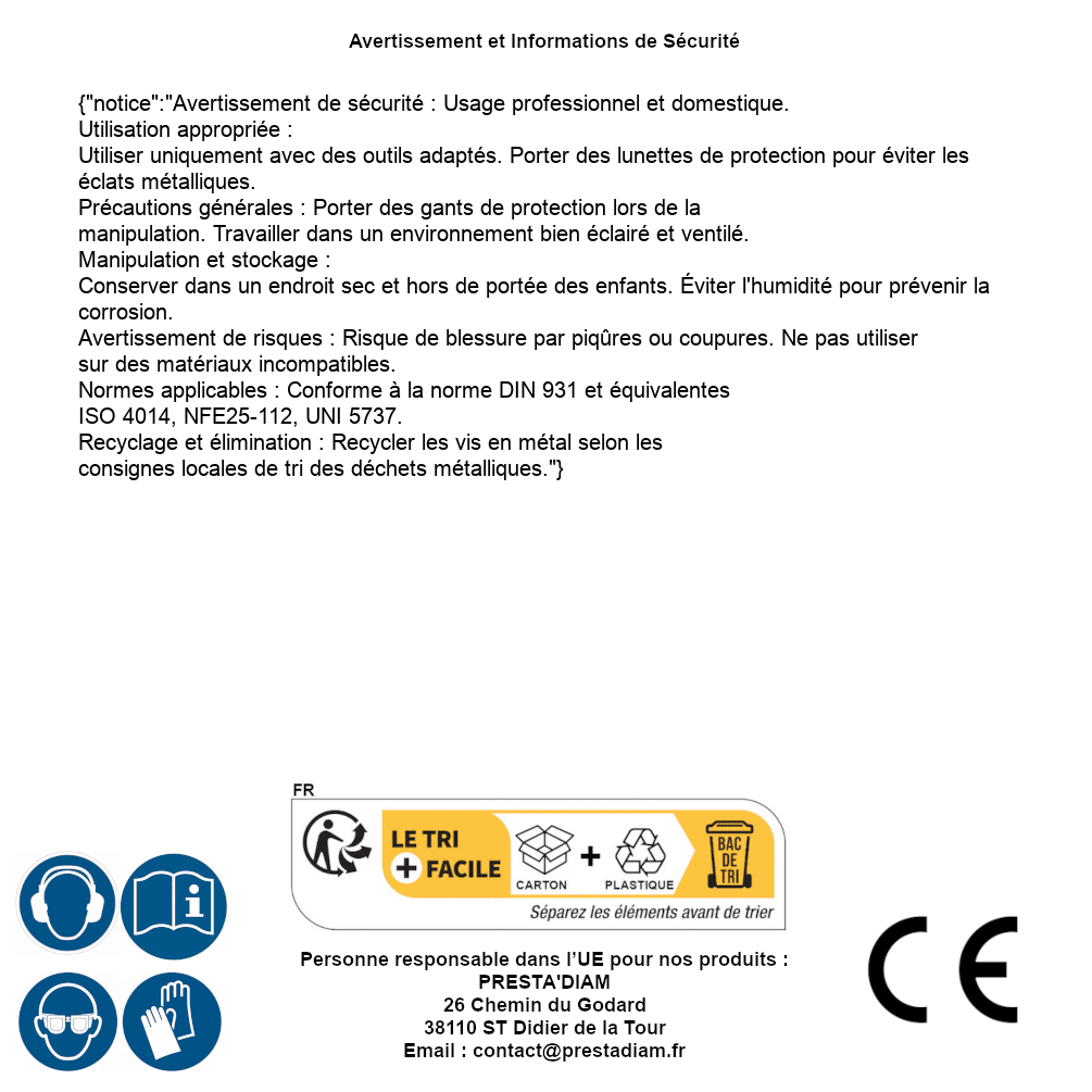| Persona responsabile UE | PRESTA'DIAM 26 Chemin du Godard 38110 ST Didier de la Tour Email : contact@prestadiam.fr |