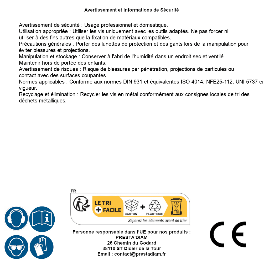 | Persona responsabile UE | PRESTA'DIAM 26 Chemin du Godard 38110 ST Didier de la Tour Email : contact@prestadiam.fr |
