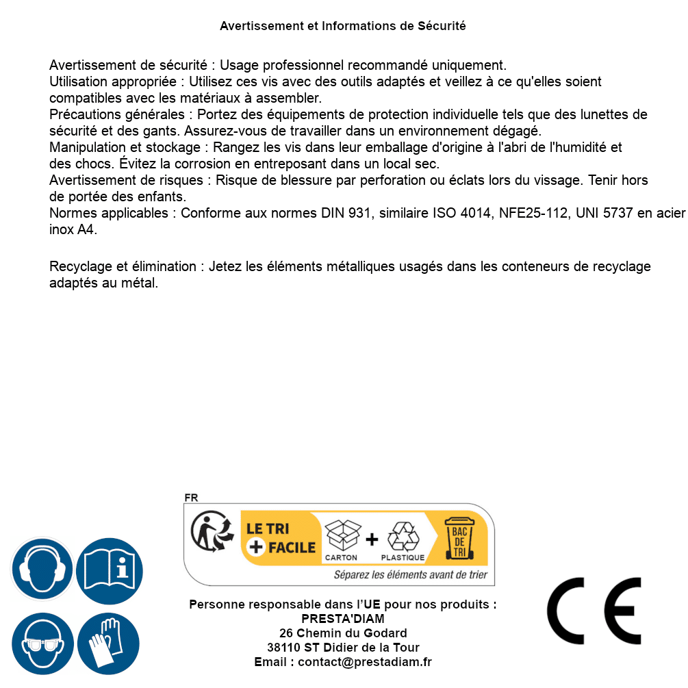 | Persona responsabile UE | PRESTA'DIAM 26 Chemin du Godard 38110 ST Didier de la Tour Email : contact@prestadiam.fr |