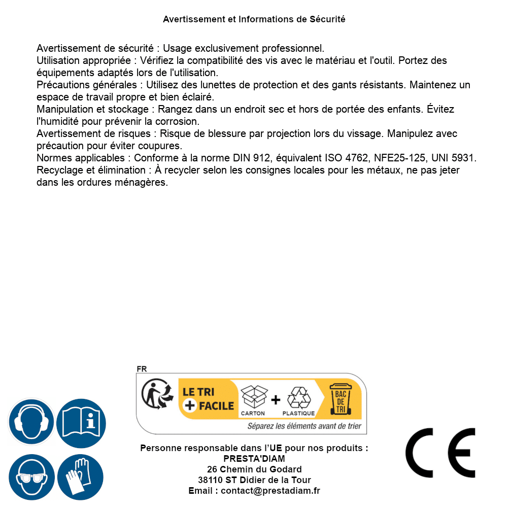 | Persona responsabile UE | PRESTA'DIAM 26 Chemin du Godard 38110 ST Didier de la Tour Email : contact@prestadiam.fr |