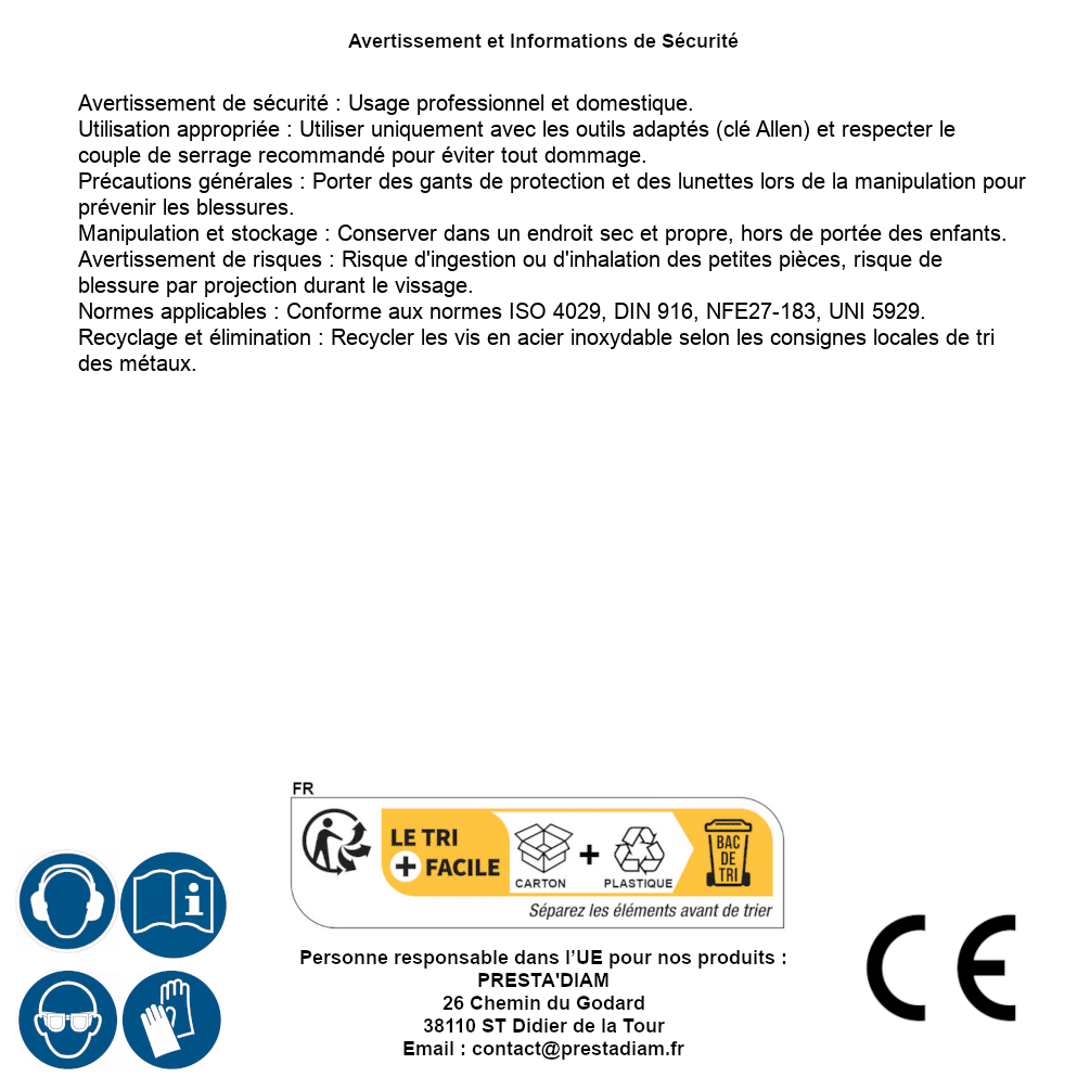 | Persona responsabile UE | PRESTA'DIAM 26 Chemin du Godard 38110 ST Didier de la Tour Email : contact@prestadiam.fr |