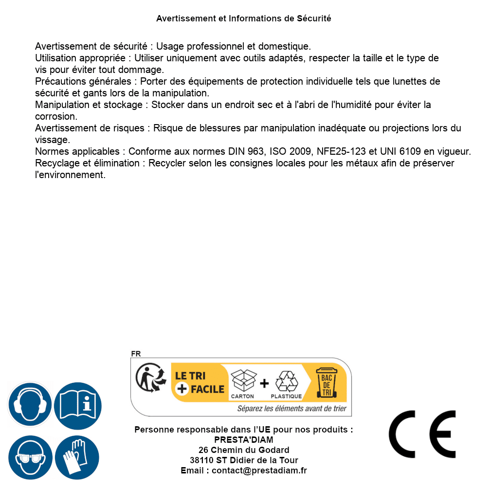 | Persona responsabile UE | PRESTA'DIAM 26 Chemin du Godard 38110 ST Didier de la Tour Email : contact@prestadiam.fr |