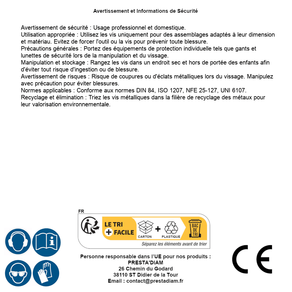 | Persona responsabile UE | PRESTA'DIAM 26 Chemin du Godard 38110 ST Didier de la Tour Email : contact@prestadiam.fr |