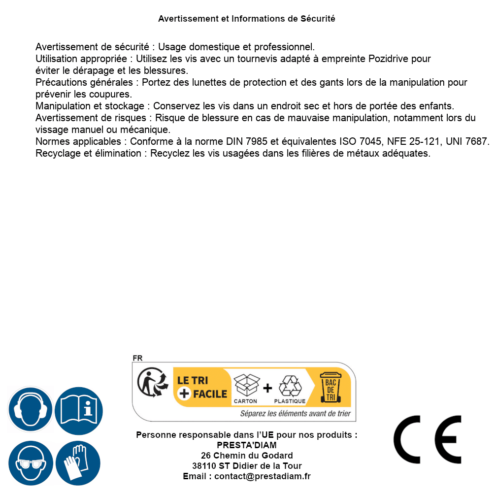 | Persona responsabile UE | PRESTA'DIAM 26 Chemin du Godard 38110 ST Didier de la Tour Email : contact@prestadiam.fr |