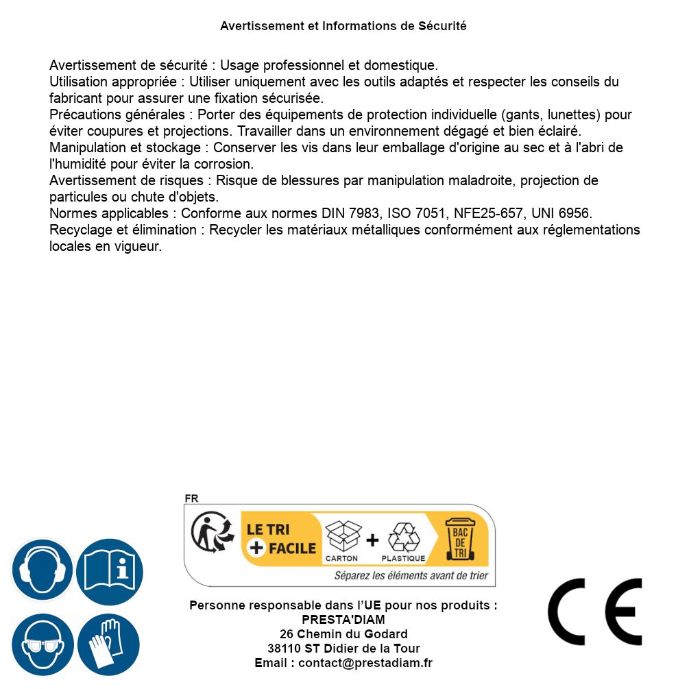 | Persona responsabile UE | PRESTA'DIAM 26 Chemin du Godard 38110 ST Didier de la Tour Email : contact@prestadiam.fr |