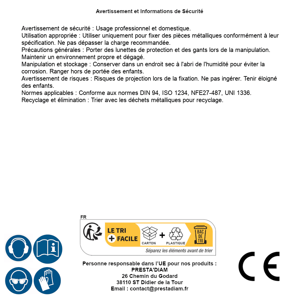 | Persona responsabile UE | PRESTA'DIAM 26 Chemin du Godard 38110 ST Didier de la Tour Email : contact@prestadiam.fr |