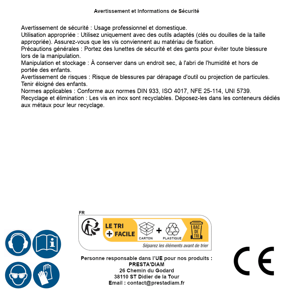| Persona responsabile UE | PRESTA'DIAM 26 Chemin du Godard 38110 ST Didier de la Tour Email : contact@prestadiam.fr |