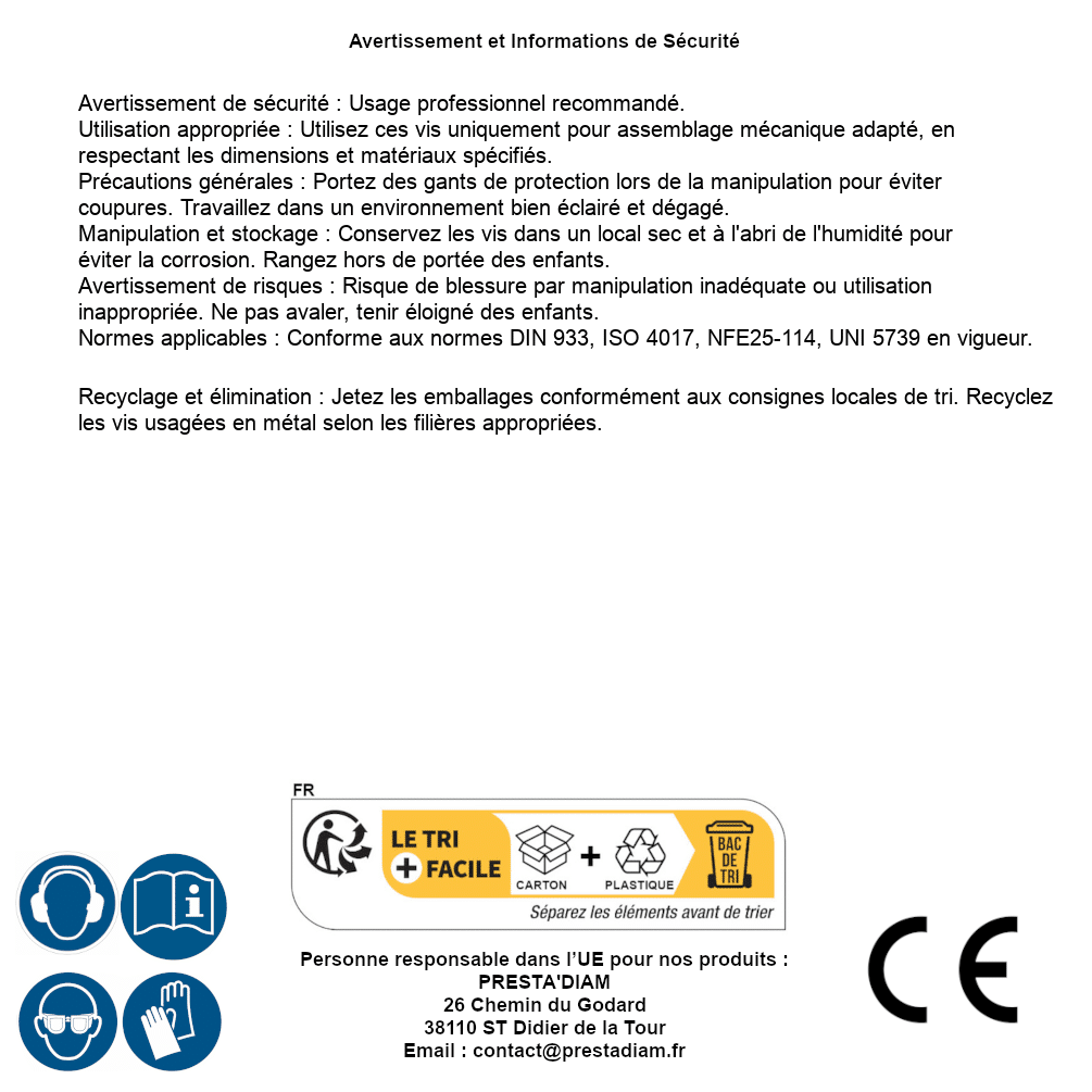 | Persona responsabile UE | PRESTA'DIAM 26 Chemin du Godard 38110 ST Didier de la Tour Email : contact@prestadiam.fr |