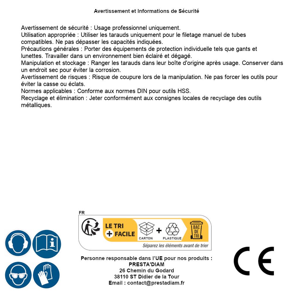 | Persona responsabile UE | PRESTA'DIAM 26 Chemin du Godard 38110 ST Didier de la Tour Email : contact@prestadiam.fr |