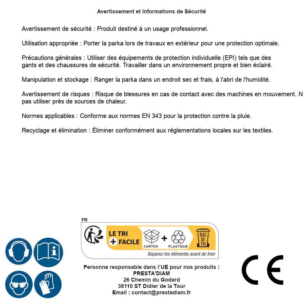 | Persona responsabile UE | PRESTA'DIAM 26 Chemin du Godard 38110 ST Didier de la Tour Email : contact@prestadiam.fr |